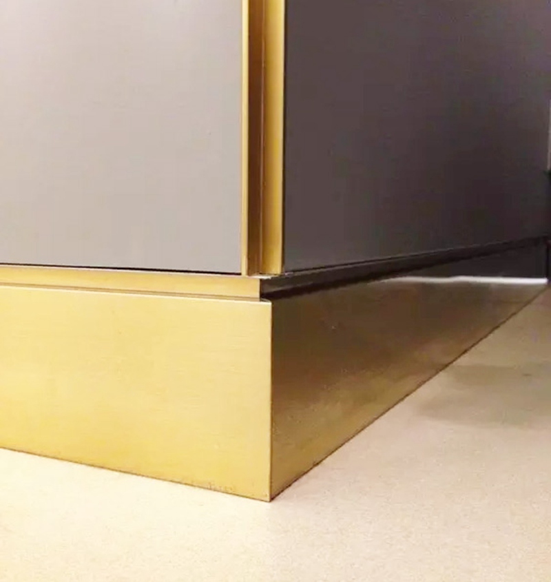 鈦金色不銹鋼踢腳線是怎么制作的?鈦金色不銹鋼踢腳線就是用鈦金色的不銹鋼板,經過刨槽折彎工藝,加工而成。