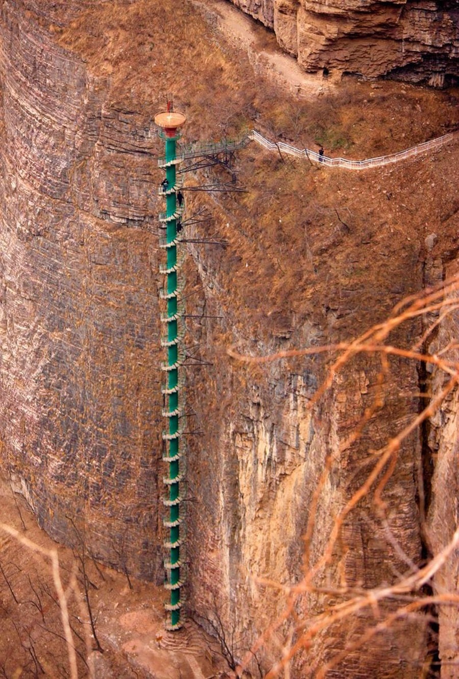 這個史詩般的螺旋結構被稱為世界上最危險的鋼樓梯,在中國河南省林州的太行山脈,有一個300英尺高的懸崖面。當你接近山頂時,撞擊的風會使關節和鉸鏈發出吱吱作響的聲,你很有可能看到一只或兩只鳥在你的頭上飛來飛去。絕對不是為了心靈的假象而散步。
